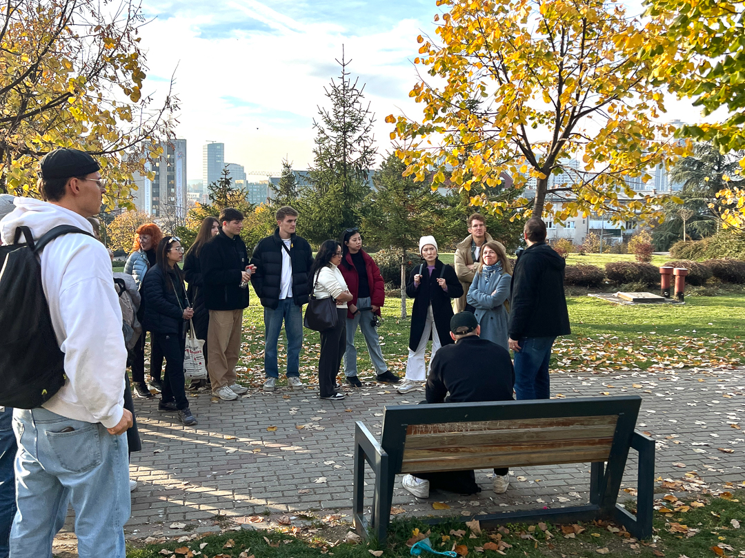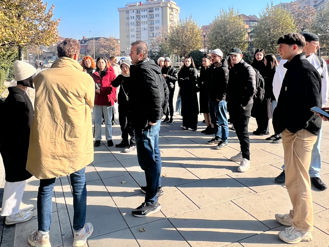 On the first day of our excursion through Prishtina, we, along with students from KIT, the University of Prishtina, and the Academy of Odessa, dived into the city’s vibrant atmosphere. Our guide, the renowned architect and head of the Kosovo Architecture Foundation, Bekim Ramku, led us through the city, offering fascinating insights into Prishtina’s architectural landscape and urban development.